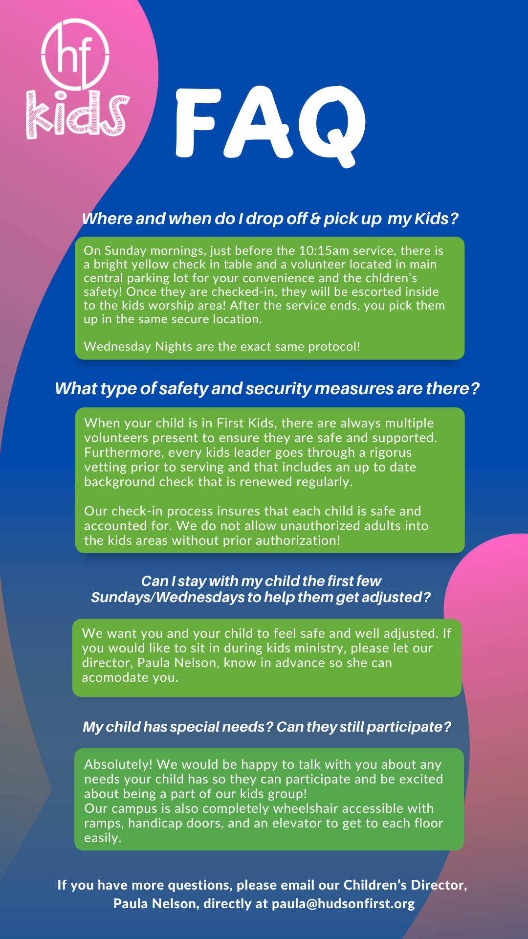 Each Sunday during the 10:15am service we host an HF Kids Worship! This kid friendly worship includes a kids bible story, worship with hand motions and dance, all complete with games and activities that further drive home the day’s lesson! Check in begins at 10 AM, and Pick up is directly after the 10:15 worship service ends.